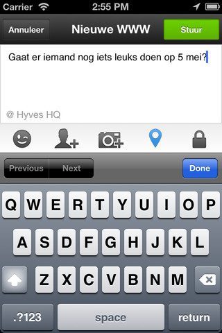 De editor waarin je een WWW invoert is vernieuwd en wel degelijk verbeterd. Met knoppen bovenaan het toetsenbord kan je een smiley toevoegen, een persoon aanhalen, een foto uploaden of bijvoegen, een locatie toevoegen en bepalen voor wie het bericht is bestemd: vrienden, vrienden van vrienden, Hyvers of iedereen.