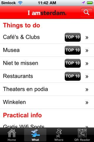 Het tabblad What heeft een andere insteek en wijst je de dingen die je kan doen. De sectie vertelt met foto’s en tekst over winkelgebieden en specifieke winkels, theaters en podia en heeft vier top 10-lijstjes van cafés en clubs, musea, restaurants en ‘niet te missen’ zaken. Opmerkelijk: er is geen enkele top 10 die zich tot 10 items beperkt. Een handige functie voor iedere bezoeker van de stad is de sectie waarin je kan zoeken naar gratis Wi-Fi spots in Amsterdam. Je kan ze sorteren op huidige afstand ten opzichte van je eigen positie, het type pand (een café bijvoorbeeld) en op alfabet.