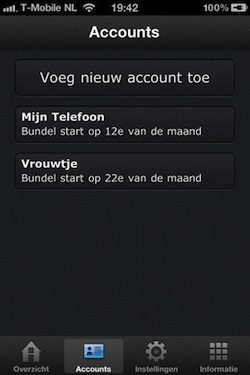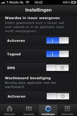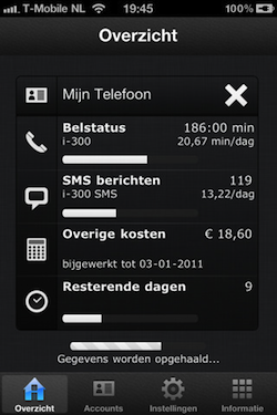Eventueel kun je de belstatus-waarde laten weergeven in het app-icoontje. Dat icoontje met een soort klappersymbool lijkt overigens wel wat op het icoontje van de eerder verschenen Belstatus-app. iBelstatus werkt met de volgende abonnementen: Flex, iPhone/iPlan, Relax en Voordeelsim. Je hebt een account op t-mobile.nl nodig en de werking van de app is uiteraard afhankelijk van de juiste werking van deze site.