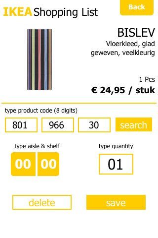 De tijd die je bespaart met het door de IKEA slenteren, dien je van tevoren echter in de app te steken. Je kan de producten van de winkel namelijk niet handmatig zoeken op soort, maar moet de productcode ervan invoeren. Die vind je in de catalogus van de IKEA of in de officiële iPhone-app. Als je de code invoert in IKEA Shopping List, krijg je een foto van het product, het magazijnreknummer en de prijs ervan te zien. Ook kan je van elk product aangeven hoeveel je ervan wilt hebben. De totaalprijs wordt er meteen op aangepast.