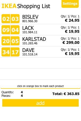 Als je geen dagdeel wilt besteden aan het verkennen van de IKEA, kan je er altijd voor kiezen om meteen door te lopen naar het magazijn en daar de meubels mee te nemen die je al in de folder aanstipte. De nieuwe iPhone-app IKEA Shopping List helpt daarbij een handje. Hij ondersteunt de vestigingen in Nederland en België en berekent de totaalprijs meteen als je de lijst samenstelt. Ook krijg je te zien in welk rek in het magazijn je een meubel kan ophalen.