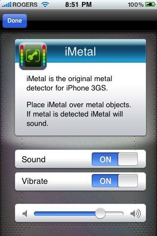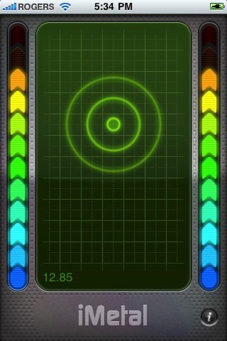 icon_BigMet de applicatie iMetal verander je je iPhone 3GS in een metaaldetector. iMetal maakt gebruik van het ingebouwde kompas van de 3GS om verstoringen door metalen objecten in het magneetveld te detecteren. Als er een metalen object in de buurt is, verandert het magnetische veld en iMetal geeft daar vervolgens melding van op het scherm. Je kalibreert de detector door te schudden met je 3GS in een ruimte waar geen metalen objecten in de buurt zijn. Zodra je bij een metalen object in de buurt komt slaan de meters aan de zijkant uit.