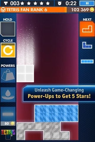 Vloeken in de kerk. Dat doet gamesuitgever EA met de nieuwe Tetris die ze vandaag heeft uitgebracht voor de iPhone en iPod touch. Tegelijk met het spoorloos verdwijnen van de vorige Tetris van EA, is er een nieuw deel uitgebracht dat in haar doen en laten het volledige originele idee van het 26 jaar oude puzzelspel omver schopt. De essentie van Tetris is: opbouwen en zorgen dat je het kan afbreken. Als het opbouwen verkeerd gaat, wordt het afbreken lastig. Je moet complete rijen maken om ze af te breken. Een gat in de rij verpest dat idee al en als je die moet opvullen, heb je Tetris op zijn best: in alle hectiek de vallende blokken zo goed mogelijk stapelen om het gat te dichten of in ieder geval het gat weer benaderbaar te maken. Dát spannende gedeelte heeft EA nu bijna volledig uit Tetris gesloopt. Het is met de nieuwe One Touch-besturing namelijk bijna onmogelijk grote gaten te maken. Zodra een blok valt, krijg je direct voorgeselecteerde vakken op het scherm waar je het kan plaatsen. Je hoeft er maar op te drukken en het blok staat er – zelfs in de gevallen waar je vroeger doldwaze capriolen voor moest uithalen en die een geweldig gevoel gaven als het lukte. Met een tik elders op het scherm, komen er vakken op andere plaatsen in het veld en zo kan je razendsnel de blokken stapelen. De functie waarmee je tenslotte een blok tijdelijk kan vasthouden om later weer in te zetten, maakt het bijna te makkelijk. Maar… ook in deze nieuwe variant van Tetris gaat de tijd sneller en sneller. Als je niet op tijd een vak selecteert, dropt het blok recht naar onder en is de schade ongekend. Na een tijdje vloeken en tieren op het nieuwe spelconcept, gaat er bij ons opeens een knopje om. Het is niet meer het Tetris van vroeger, maar het werkt als een raket. Qua besturing is het bovendien een stuk controleerbaarder dan de oude touch-variant die behouden is gebleven in de Marathon-modus. Ook qua uitstraling en aanpak is Tetris verder dik in orde. Als je een Origin-account hebt, kun je de highscores van vrienden verslaan voor bonussen. Daar krijg je T-Coins voor die je naar een hoge rank helpen en waarmee je nieuwe uitdagingen in de Galaxy-modus vrijspeelt. Daarin moet je ter plekke kiezen waar een blok komt te staan en gaat het level snel naar beneden. Ook kan je power-ups inzetten om je doel te halen. Het heeft nauwelijks nog iets met Tetris te maken, maar dankzij de One Touch-besturing voelt het snel en krachtig. Het is een rare tegenstelling. EA heeft Tetris finaal om zeep geholpen maar tegelijkertijd wel een van de strakste highscore-spellen op de iPhone en iPod touch uitgebracht. We zeggen het als nostalgisten oprecht met frisse tegenzin: deze Tetris is steengoed.