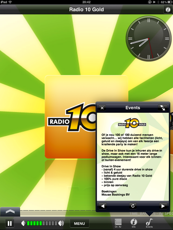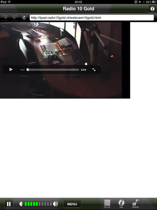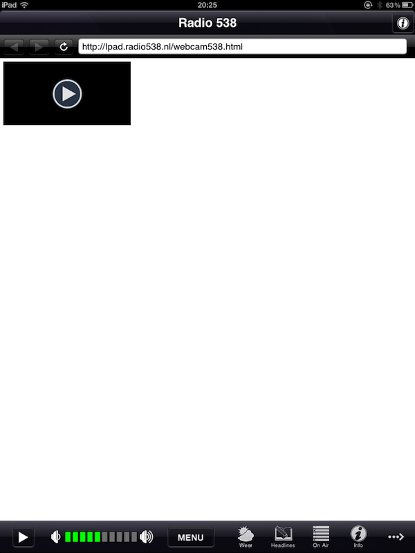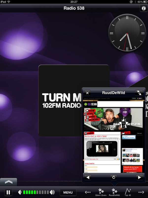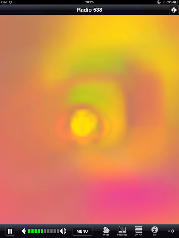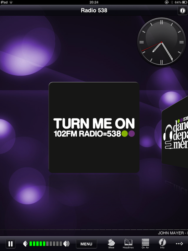 Radio 538 iPad Edition biedt niet alleen de mogelijkheid om te luisteren naar Radio 538, maar ook naar 538Juize, 538 Dance Department, 538 Hitzone, 538 Non-stop 40, 538 Party, 53L8, RTL Lounge en VI Radio. Tijdens het luisteren kun je een visualisatie aanzetten en onderin het scherm zie je welk nummer je aan het beluisteren bent. Daarnaast heb je toegang tot informatie zoals de programmering, shownieuws en verschillende programmawebsites. De sites worden helaas te klein weergegeven en werken maar half door het gebrek aan Flash en Silverlight. Ook is via het menu de webcam beschikbaar, maar die wordt maar heel klein weergegeven in een lelijk browserscherm. Als je de webcam start krijg je ook nog eens twee streams door elkaar te horen. De applicatie heeft daarnaast een eigen volumecontrole naast die van de iPad zelf, wat verwarrend is.