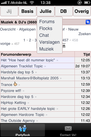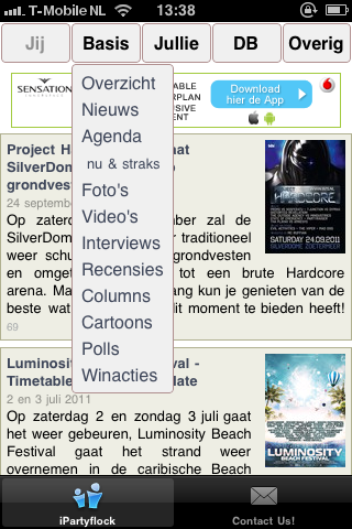 De website Partyflock ging altijd meer om de inhoud dan om het ontwerp. Dat zie je al vanaf het moment dat je de website betreedt en hetzelfde gevoel bekruipt je meteen als je de vanochtend verschenen applicatie opent. Onderin beeld staan slechts twee tabbladen om uit te kiezen: iPartyflock en Contact Us. Boven in beeld staan echter vijf knoppen die allen een uitvouwmenu tonen en daar stikt het van de mogelijkheden. Alleen al onder de voornaamste knop, ‘Basis’, staan maar liefst 12 pagina’s om te bezoeken! ‘Jullie’ biedt er nog eens 5, ‘DB’ telt er 8 en onder ‘Overig’ scharen zich de laatste 11 pagina’s. Helemaal links in beeld staat de knop ‘Jij’, waarin je je kan inloggen en aanmelden.