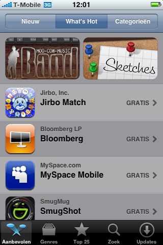Vandaag ging rond 12:00 uur Nederlandse tijd Apple’s App Store online. De applicatie op de iPhone heeft nog wel wat stabiliteitsproblemen: in vijf minuten crashte de applicatie minstens vijfmaal. Dat zou aan de massale toestroom van klanten kunnen liggen, maar omdat nog maar weinig mensen toestellen met iPhone-firmware 2.0 hebben lijkt ons dat sterk. In de applicatie vind je bovenin drie knoppen (Nieuw, What’s Hot en Categorieën). Onderin het scherm vind je net als in de iPod-applicatie van de iPhone vijf knoppen: Aanbevolen, Genres, Top 25, Zoek en Updates.