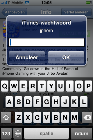 - Bij het installeren van de eerste applicatie moet je je iTunes-wachtwoord opgeven.