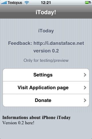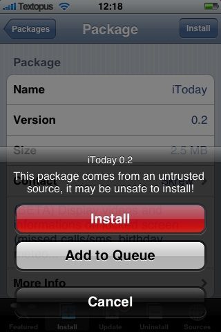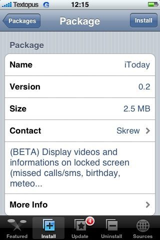 iToday is te installeren via de Skrew source. Vergeet niet om eerst SkrewCommon 1.31 te installeren en denk bij het deïnstalleren van iToday eraan om eerst de applicatie te deactiveren, waarna je zowel iToday als SkrewCommon weer verwijderd, om ervoor te zorgen dat je na de deïnstallatie geen restanten van het programma meer op je startscherm te zien krijgt.