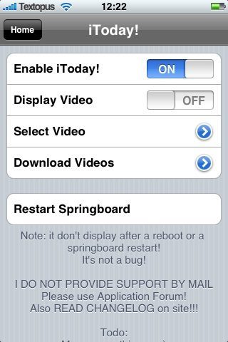 iToday heeft een update gekregen naar versie 0.2, met als belangrijkste verbetering dat de videowallpaper kan worden uitgeschakeld. Ook de batterijstatus nu zichtbaar.