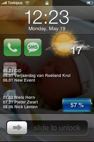 Het eindresultaat (nee, de baby is niet van mezelf).De lockscreen-applicatie iToday heeft in een paar dagen de sprong gemaakt van versie 0.1 naar 0.2. Op het lockscreen zelf wordt nu extra informatie getoond, zoals de drie eerstvolgende afspraken in je agenda en de batterijstatus, uitgedrukt in een percentage. Een belangrijke andere verbetering is dat de video-wallpaper, die veel mensen toch liever niet gebruiken, nu standaard staat uitgeschakeld. Op het instellingenscherm heb je de mogelijkheid om de weergave van video te activeren.