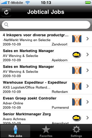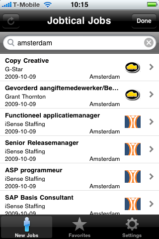 Nu het economisch wat minder gaat en veel mensen hun baan zijn verloren, is het aantal werkzoekenden flink gestegen. Jobtical springt hier op in door het tonen van nieuwe vacatures op je iPhone. Van ontwikkelaar Mad44 kregen we alvast een preview van de applicatie. Jobtical is een vacature-zoekmachine die de laatste vacatures van Monsterboard, Jobtrack en de Nationale Vacaturebank op je iPhone toont. Je kunt binnen de getoonde vacatures filteren op vacaturenaam of plaatsnaam en de voor jou relevante vacatures toevoegen aan je favorieten. Het klikken op een vacature brengt je naar de detailpagina op een van de genoemde websites.