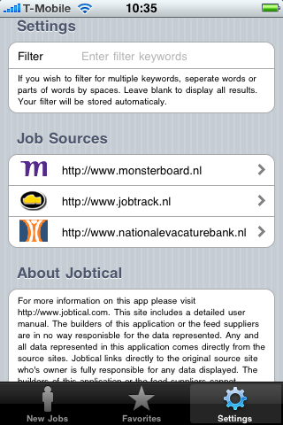 Momenteel blijft het zoeken beperkt tot het filteren op steekwoorden binnen de getoonde vacatures. Het klikken op een vacature brengt je naar de weergave zoals die op de gewone website ook te vinden is. De functionaliteit van Jobtical is mede daardoor nu nog vrij basic. Mooier zou het zijn wanneer de vacaturedetails in een iPhone-vriendelijke versie zouden worden getoond.