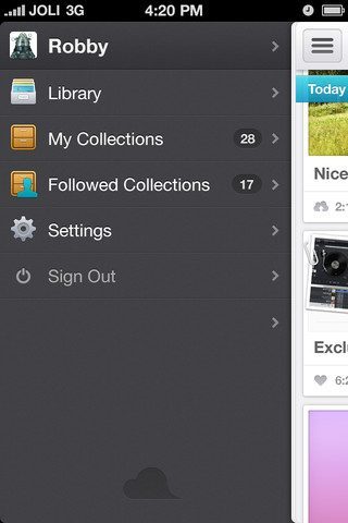 Jolicloud gebruikt de inmiddels steeds gangbaardere interface met een centraal menu en een pagina rechts en links daarvan die als het ware in beeld schuiven. Aan de linkerkant huizen toegangsknoppen tot de volledige bibliotheek van berichten, je eigen collecties, collecties van anderen die je volgt en de instellingen waar je de sociale netwerken kan koppelen. Rechts van de hoofdpagina tref je Facebookvrienden die de dienst ook gebruiken. Als je op een naam hebt gedrukt, zie je diens overzicht gedeelde collecties en kan je die volgen. Zo maakt Jolicloud het eenvoudiger om specifieke onderwerpen van personen te volgen, anders dan personen zelf. De voorwaarde is natuurlijk wel dat zij hun collecties zo indelen dat jij er wat aan hebt.