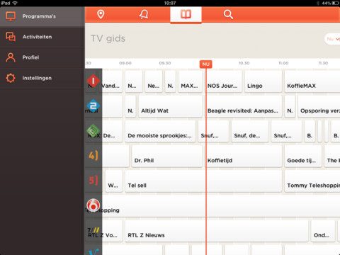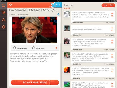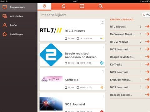 Het zenderoverzicht zie je in het voornaamste tabblad Programma’s. Links staan de zenders onder elkaar en in een tijdbalk rechts kan je zien wanneer welke uitzending begint en eindigt, overzichtelijk alles onder elkaar. Met een optieknop kan je schakelen van de programma’s van het moment, tijdens primetime of die van morgen en overmorgen. Elk programma heeft een beknopte beschrijving en laat je in een oogopslag zien hoeveel andere gebruikers en vrienden ernaar kijken. Als het programma nu bezig is, geef je met een druk op een knop meteen aan dat je het kijkt. Dat krijgen je vrienden in de app vervolgens te zien. Ook kun je het koppelen aan een bericht op Facebook en Twitter, maar dat hoeft niet.