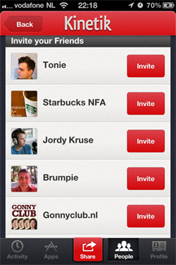 Toch maar eens zelf proberen, deze app. We installeren de app en na het wegklikken van het aanbod om push notificaties te ontvangen, kom je op een scherm waarop de aanbevelingen te lezen zijn. Helaas is er momenteel nog maar één persoon, een zekere Franco Carrera, die al mijn vriend schijnt te zijn. Er is een optie om vrienden uit te nodigen, maar daarbij kun je niet zien of de betreffende persoon al Kinetik-gebruiker is. Zouden de mensen achter de Twitter-accounts van Vodafone Webcare, KPN Mediarelaties, Twitter Nederland en Sony Ericsson NL echt actief zijn op Kinetik? Ik betwijfel het. Voorlopig zit ik dus even zonder vrienden, want ik ben niet van plan om al die bedrijven zomaar te gaan spammen.
