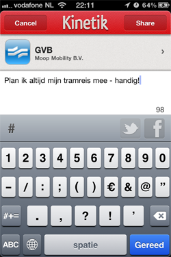 Als je een app deelt, kun je dat delen via Twitter of Facebook. Gelukkig gebeurt dat niet automatisch. Hoe meer vrienden je toevoegt, hoe gevarieerder je lijst met aanbevelingen wordt. Maar eerlijk gezegd… als de app me niet meer handvaten geeft om Kinetik-gebruikende vrienden op het spoor te komen, heb ik weinig zin om mensen zomaar uitnodigingen te gaan sturen. Iemand die ik als test uitnodigde (@renssies) keek nogal vreemd op van de Engelstalige tekst die ik hem geautomatiseerd stuurde. En hij gebruikte de app niet eens, dus zit op zo’n moment ook helemaal niet te wachten op mijn ongevraagde spam. Oppassen dus, met het zomaar uitnodigen van mensen! Omdat Kinetik toch al mijn Twitter-naam en e-mailadres heeft, was het een kleine moeite om die lijsten even te vergelijken, om te zien welke vrienden al actieve gebruiker zijn van de app. Dan voel je je ook minder bezwaard om iemand een uitnodiging te sturen.