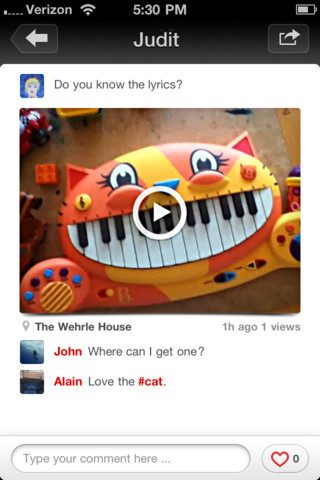 De video op de eigen pagina wordt vooraf gegaan door de naam van de uploader en aan de onderkant voorzien van reacties. Helemaal linksonder, in een knopje naast het tekstvak voor een eigen reactie, staat een ronde knop met het aantal hartjes dat een video krijgt. Tik erop en je verhoogt de teller. Rechts van het tekstvak staat de knop Share, waarop een video opnieuw kan worden gedeeld via de eerder genoemde externe netwerken.