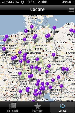 In de applicatie kun je een overzicht krijgen van alle ondersteunde kranten in een grote lijst, waarin je kunt zoeken met de zoekbalk bovenaan. Handiger en leuker is het echter om de Locate-functie te gebruiken. Daarmee krijg je een kaart te zien van waar je je op dat moment bevindt en welke kranten er daar te lezen zijn. Voor Nederland zijn dit bijvoorbeeld het Parool, Trouw, het AD en de Metro. Vanuit deze mapview kun je ook de rest van de wereld verkennen door met schuiven en zoomen naar een andere plaats te navigeren.