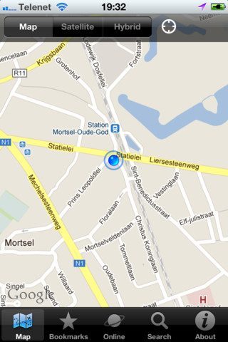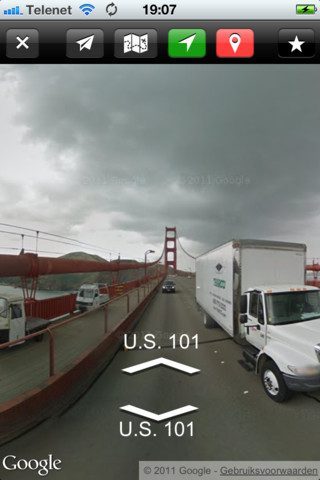 Als je de app opstart, zie je Nederland en België op een Google Maps-kaart in beeld. Met een druk op de locatieknop bovenin wordt je locatie opgezocht en door vervolgens op de blauwe stip in beeld te drukken die je locatie aanduidt, activeer je de Street View-weergave. Op dat moment verandert de interface van de app, die je ook liggend kan gebruiken. Behalve met het kompas kan je ook zelf draaien en scrollen door het beeld, maar dat gaat niet zo snel als in de standaard Google Maps-applicatie. Met knoppen bovenin kan je de locatie delen, zien op kaart, het ronddraaien per kompas uitschakelen en een locatie aan favorieten (bookmarks) toevoegen.