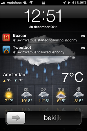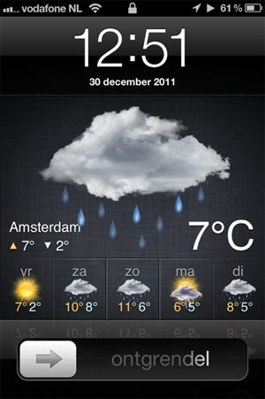 Toch maar wachten op de jailbreak voor mijn 4s en dan gewoon Lockscreen Info met de Weather plugin 🙂