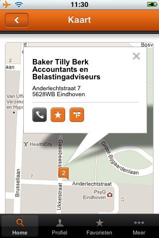 Het hoofdmenu herbergt tevens twee andere informatiestromen: algemene informatie over een gemeente en het laatste nieuws ervan. Aan de pictogrammen ervoor, kan je zien dat het laatste nieuws wordt opgehaald met een RSS Feed. De keuze voor de nieuwsstroom gaat in het geval van Groningen fout. Daar stromen niet de laatste actuele berichten in, maar vacatures. We weten niet hoe het bij andere gemeentes is. Ook voelt de applicatie opvallend instabiel in het hoofdmenu, terwijl hij de zoekresultaten wel vloeiend laat zien. Die zijn bovendien voorzien van een telefoonnummer, zodat je meteen contact kan opnemen met het zoekresultaat. Favoriete adressen kan je toevoegen als favoriet om ze later snel benaderbaar te maken. Je kan een profiel aanmaken, maar dat lijkt nergens voor nodig.