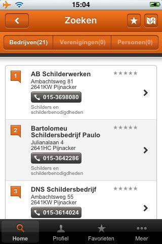Dat is geen toeval: LokaalTotaal.nl is onderdeel van De Telefoongids en is dus al een vrij prominente speler in het indexeren van adressen. Dat betekent dat je meteen aan de slag kunt en bijvoorbeeld niet hoeft te wachten omdat een gemeente of gebied nog niet is toegevoegd. De app indexeert twee soorten zoekresultaten: bedrijven, verenigingen en personen. Je kan de eerste twee gecategoriseerd opzoeken in het hoofdmenu, waarin ze zijn onderverdeeld in allerlei onderwerpen. In een alfabetische lijst, zie je meteen hoeveel resultaten een onderwerp herbergt. Toch is het de zoekbalk in het hoofdmenu nog praktischer. De app raadpleegt bij het opstarten kort je locatie en met een trefwoord kan je vervolgens zoeken in bedrijven, verenigingen en personen die ermee te maken hebben in je eigen gemeente.
