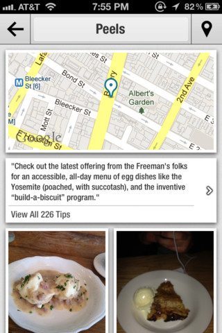 Niet alleen het resultatenoverzicht ziet er verzorgd uit; dat geldt ook voor de pagina van een eettentje of uitgaansgelegenheid. Bovenin beeld staat de locatie op een kaart aangegeven, daaronder prijkt een balk naar de verschillende tips en weer daaronder zie je op Foursquare toegevoegde gebruikersfoto’s. De tips bestaan uit enkel tekst en een bron. En: op elke pagina van een aanrader, kan je met een knop rechtsboven in het scherm alsnog naar dezelfde tent in de Foursquare-app, waar ingechekt kan worden. Zo is Lunchbox niet alleen een handige uitgaanszoeker voor niet-Foursquare gebruikers.