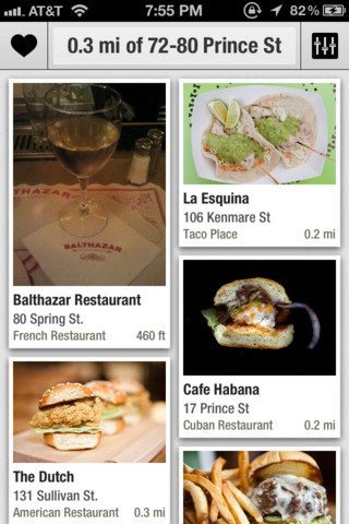 Het is een lekker simpele app. Na een keer toestemming geven, zoekt de applicatie al naar aanraders in de buurt. Standaard zoekt hij niet verder dan een halve kilometer afstand, maar je kan de afstand vergroten door het de bovenste, centrale knop de kaart uit te zoomen tot het gebied dat je wilt doorzoeken. De resultaten worden snel geladen in een fraaie pagina met foto’s en de namen van de tentjes. Resultaten met veel tips komen automatisch hoger op de ladder te staan.