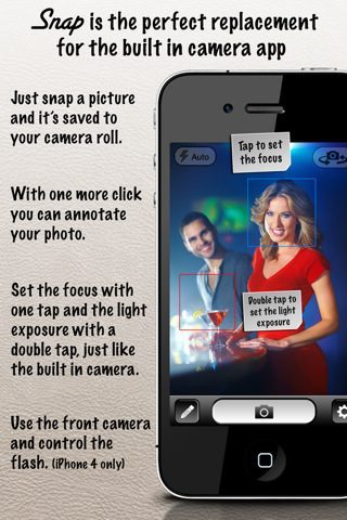 Bij het foto’s nemen in de applicatie kun je nu tweemaal op het beeld tappen om naast de autofocus, ook de lichtbalans in te stellen. Net als in Camera+. Het lijkt alsof de makers hun zinnen hebben gezet op die populaire applicatie, want op een screenshot in de App Store valt te lezen dat je Snap! uitstekend kunt gebruiken als vervanger van de standaard meegeleverde Camera-app op de iPhone. Zo kan je foto’s ook meteen voorzien van geo-data.