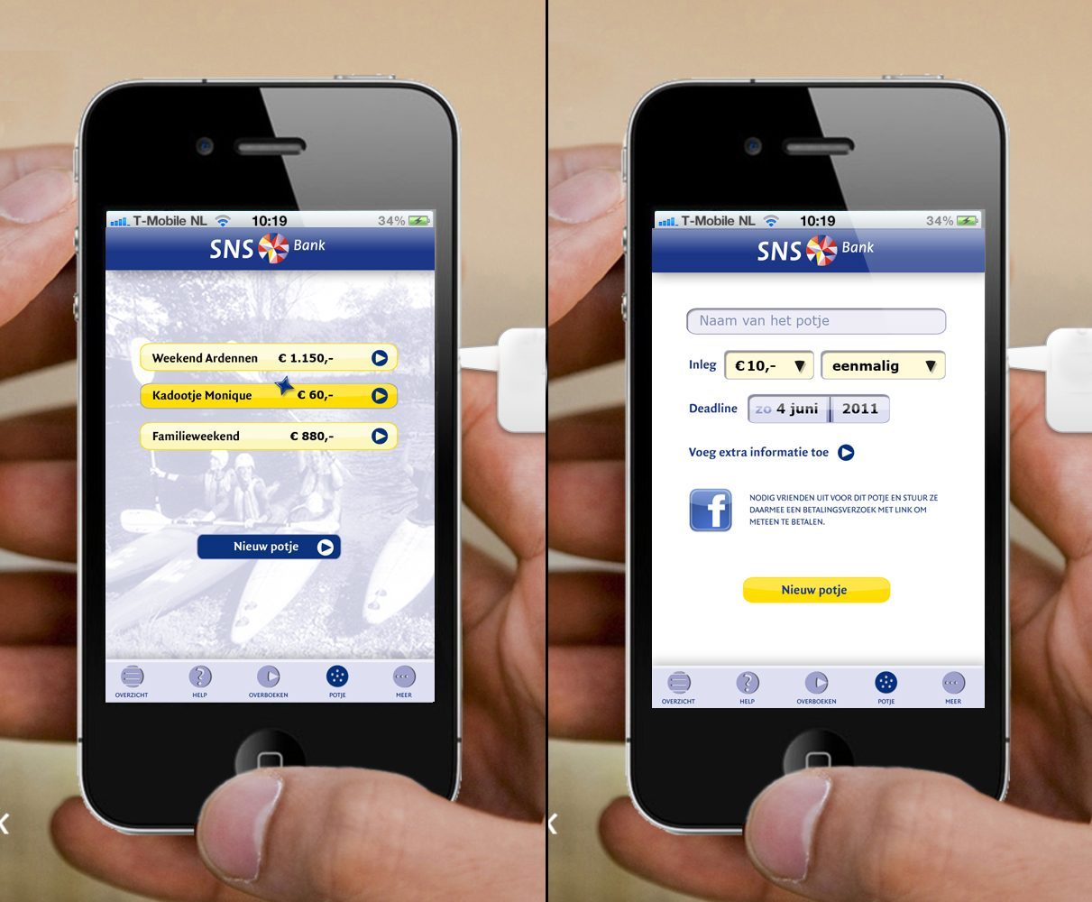 Koenen kwam bijvoorbeeld met het idee om geld te kunnen ‘overbumpen’ tussen telefoontoestellen, vergelijkbaar met het delen van informatie via Bluetooth door apps als Bump. Ook stuurde hij het idee in om uitgaven visueel te presenteren, bijzondere afschriften te kunnen vastleggen en gegevens te kunnen invoeren door middel van scannen. Blarinckx kwam met ideeën als het combineren van verkoop en service, het categoriseren van uitgaven, de locatiezoeker voor SNS Winkels en geldautomaten en een alarmknop als je je bankpas kwijt bent.
