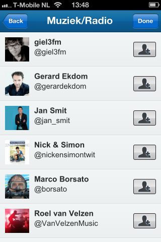 Om Meet the Tweet te gebruiken, moet je al wel eens op Twitter hebben rondgekeken. Je hebt namelijk de gebruikersnamen van de personen nodig die je wilt volgen, en vindt geen personen door op hun volledige naam met spaties te zoeken. Gebruikersnamen invoeren is het eerste wat je doet in de applicatie. Als een naam herkend is, wordt hij meteen toegevoegd aan het lijstje personen die je volgt. Als die lijst klaar is, druk je op de grijze balk Done onderin het scherm en kom je terecht in de timeline met de laatste berichten van je gevolgden. In de Instellingen kun je aangeven of je ook de reacties op andere twitteraars van ze wil lezen, of dat je alleen eigen opmerkingen zonder reacties op anderen wilt zien.