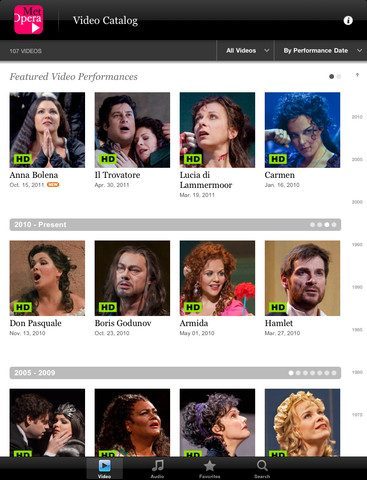 HD-uitzendingen van opera’s, supersterren als Plácido Domingo, Deborah Voigt en Natalie Dessay en meer dan 250 radiouitzendingen die terug in de tijd gaan tot 1936. En dan zijn er nog klassieke uitzendingen van 1977 tot 2001, met onder andere Aida met Leontyne Price en La Bohème met Luciano Pavarotti. Als je nog niet weet waar het over gaat, ben je vermoedelijk niet de doelgroep van de nieuwe iPad-app Met Opera on Demand. De app voorziet in audio- en videobeelden van opera’s. Een abonnement op de dienst kost 14.99 dollar per maand.