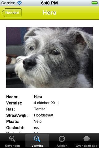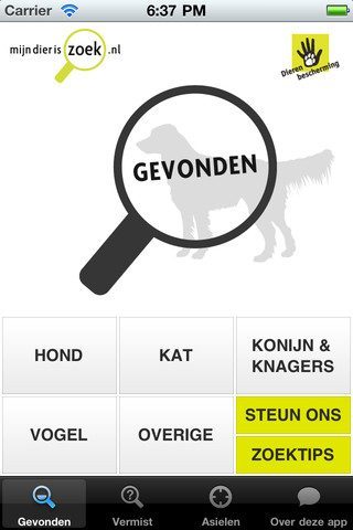 Mijn dier is zoek iPhone iPod touch vermiste dierenIs je kat of hond spoorloos verdwenen? Je kan een poster aan de bomen in de buurt hangen. Misschien is het nog wel de beste optie van allemaal. Maar het gaat wel om je trouwe viervoeter, dus liever het zekere voor het onzekere toch? Daar kan Mijndieriszoek.nl uitkomst bieden. De website heeft onlangs een gelijknamige iPhone-applicatie uitgebracht waarop je kan zien welke dieren worden gezocht door hun baasjes en opgevangen zijn in asielen. Daar zitten overigens ook vogels, konijnen en exotischere dieren tussen.