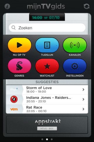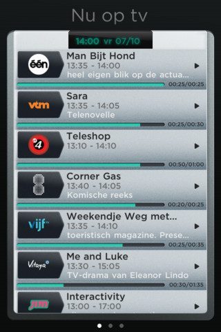 Eerst stel je in of je de Belgische of de Nederlandse zenderlijst wil instellen in Mijn TV Gids. De instructies die je daarna te zien krijgt als je de app de eerste keer opstart, staan er niet voor niks. Mijn TV Gids biedt namelijk nogal wat mogelijkheden om het aanbod op televisie tot je nemen. Het hoofdmenu bevat zes knoppen. Twee ervan, Nu op tv en Kanalen, kan je ook bereiken door te swipen tussen de pagina’s. Rechts wordt het Kanalen-overzicht getoond, waarin je zenders als de knoppen van afstandsbediening kan bereiken. Als je een zender ingedrukt houdt, kun je hem wijzigen van positie conform je eigen zenderindeling. De nieuwe positie wordt overal in de app doorgevoerd. Dus ook in ‘Nu op tv’, het scherm links van het hoofdmenu. Daar staan de zenders onder elkaar en zie je met een groene statusbalk hoe lang het huidige programma al bezig is en welk programma dat is.
