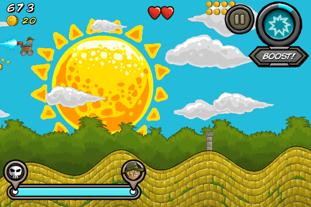 Het idee van het ontwerp van de game komt natuurlijk van Indiana Jones. Op de achtergrond van het startscherm zie je een vervallen tombe en in de game race jij, de cowboyhoeddragende man in het mijnkarretje, weg voor een militaire achtervolger. Het gaat in het begin wel allemaal iets hobbeliger en moeilijker dan in Tiny Wings. Maar goed, je zit dan ook in een mijnkarretje zullen we maar zeggen. De voornaamste oorzaak hiervan is dat de besturing in Minecart Chase iets drastischer reageert dan in Tiny Wings. Een mijnkarretje van een paar honderd kilo zal dan ook wat sneller naar beneden komen dan een schattig vogeltje. Als je hier eenmaal aan gewend bent, dan gaat de besturing prima. De game is wel iets moeilijk onder de knie te krijgen dan Tiny Wings, vooral omdat de heuveltjes vaak kort en klein zijn en timing dus nog belangrijker is. In tegenstelling tot Tiny Wings is ook het einde van een eiland halen niet een waarborg voor het halen van het volgende level. Je zult iedere keer zo veel mogelijk snelheid moeten maken om de laatste sprong te overleven.