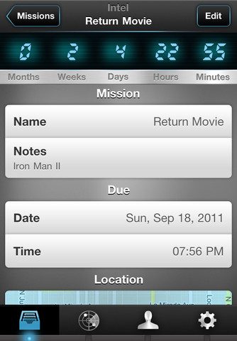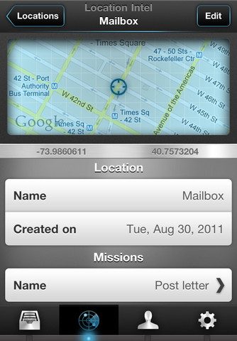 De pagina van een aangemaakte taak heet Intel en bevat de naam, de omschrijving, de datum en tijd en een kaartje van de aangehechte locatie. Missions werkt op locaties en kan behalve reminders op tijd ook herinneringen sturen als je op een zekere locatie komt. Je kan de huidige locatie selecteren of zelf een plek op de kaart aanwijzen. Daarbij kan je ook de radius van de kring om de locatie instellen. Overigens kun je de uit te voeren missies niet alleen in het hoofdmenu bekijken, maar ook per locatie op de Locaties-pagina.