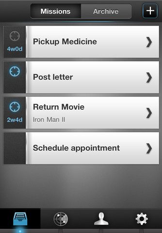 Het Missions-principe is doorgevoerd in de hele to-do lijst. Als een ‘missie’ actief wordt, krijg je een pushbericht dat je aan een taak moet beginnen. Als die vervolgens wordt afgerond, komt hij bij Completed missions te staan in de profiel-tab. Aborted missions staat voor afgebroken taken en dan zijn er ook nog achterstallige missies, die niet zijn uitgevoerd: Overdue Missions.