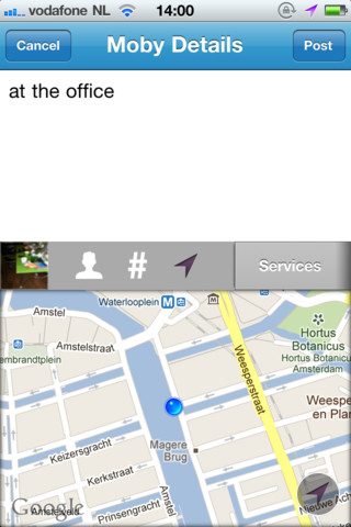 Zodra je op de blauwe walvisknop in het midden drukt, maak je eerst een keuze wat voor ’n type bestand je wilt uploaden. Bij foto of video kom je daarna automatisch in de camerastand van de iPhone terecht. Met de knop linksonder kun je bestanden uit je fotoalbum plukken. Bij het uploaden van een bestand geef je met de knop Services net boven het toetsenbord aan op welke netwerken het gepubliceerd moet worden. Als je een foto uploadt moet je YouTube daarbij overigens aanklikken op het uit te zetten. Raar dat dat niet vanzelf gaat.