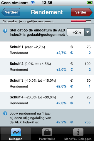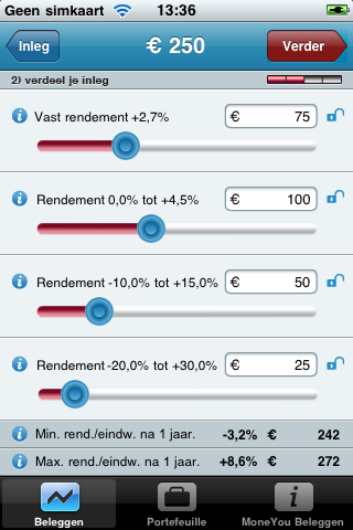 Na installatie van de app krijg je een scherm te zien met drie tabbladen: Beleggen, Portefeuille en een informatietabblad met veelgestelde vragen. Het beleggen bestaat uit vier stappen: je bepaalt in stap 1 hoeveel je wilt beleggen (dit moet een bedrag tussen 1 en 1 miljoen euro zijn) en geeft vervolgens in stap 2 aan hoe je dat bedrag wilt verdelen. Met behulp van schuifjes bepaal je welk gedeelte een vast rendement van +2,7% moet hebben en voor welk gedeelte je grotere koersschommelingen acceptabel vindt. Je kunt daarbij ook een bepaald onderdeel vastzetten met een hangslotje. Wil je bijvoorbeeld de helft van je inleg een vast rendement geven en met de rest van het geld wat meer risico’s lopen, dan kan dat. Bij het verplaatsen van de schuifjes zie je meteen wat het minimum- en maximumrendement na 1 jaar is.