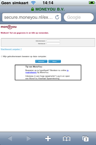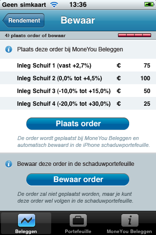 Klaar met rekenen? Dan kun je in stap 4 een order plaatsen bij MoneYou Beleggen. Dat is ook het moment waarop je moet inloggen met je account. Helaas is dat ook meteen het minst geslaagde onderdeel van de app: de iPhone-applicatie sluit af en stuurt je door naar de website van MoneYou (een ingebouwde browser in de app was mooier geweest), die totaal niet is geoptimaliseerd voor mobiel gebruik. Dat wordt dus pinchen en scrollen om het juiste vakje te vinden om te kunnen inloggen. Omdat ik geen rekening bij MoneYou heb, kon ik niet controleren hoe het daarna verder gaat, maar ik neem aan dat je de gekozen bedragen en risicoverdelingen niet nogmaals moet invoeren. De parameters die worden meegestuurd naar de website bevatten de inleg die je hebt gekozen.