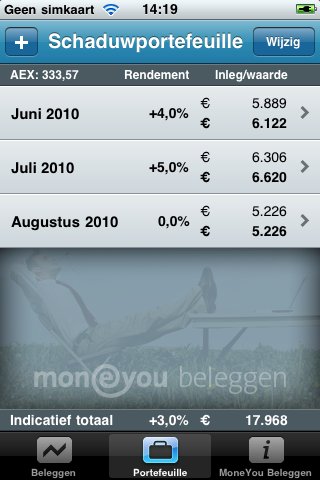 MoneYou bevat ook een tweede tabblad waar je een schaduwportefeuille kunt invullen. Dit geeft aan wat je inleg is geweest en wat je huidige waarde is bij het aangegeven rendement. Het laatste tabblad ‘MoneYou Beleggen’ bevat simpelweg informatie over zaken als: wat is de AEX Index, waar vind ik brochures en voorwaarden en welke kosten zitten eraan vast? Daar is ook te lezen dat MoneYou 100% dochter van ABN AMRO is.