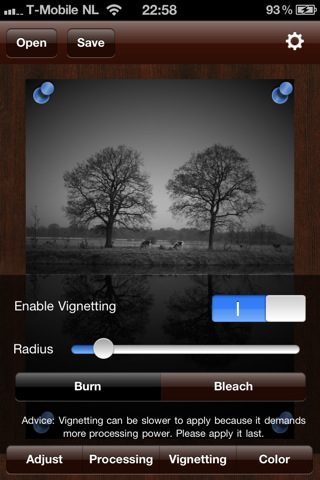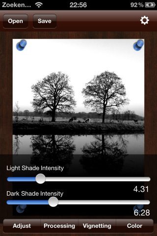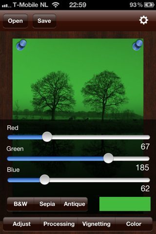 De toegevoegde filters geven je de mogelijkheid om groen, blauw, cyaan, magenta en geel aan je foto toe te voegen. Ook is er een default-optie waarin je zelf een kleur kunt mengen. Bij iedere filter kun je de intensiteit van donkere en lichten kleuren aanpassen. Een vignette-filter voegt het lens-effect van oude analoge foto’s toe. Hierdoor zie je in de hoeken de foto donkerder worden, waardoor het bijna lijkt alsof de afbeelding rond is. De intensiteit hiervan is ook met een schuifbalk aan te passen.