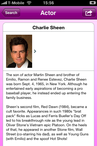 Naast het zoeken op filmtitel kun je ook de voor- of achternaam van een acteur of regisseur ingeven. Daarna kun je de biografie lezen, foto’s bekijken, alle films bekijken (filmografie) waar hij of zij inzit en korte video’s bekijken van films van die acteur of regisseur. Ook kun je vanuit de applicatie iemand een e-mail sturen met daarin informatie over de film of acteur.