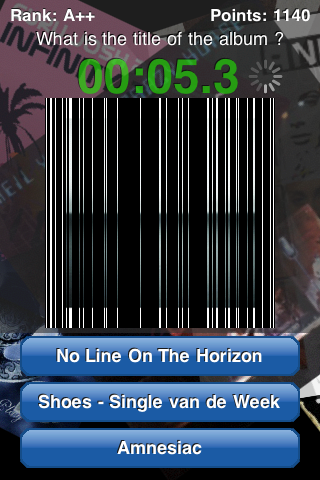 Er zijn ook vragen waarbij je de albumhoes moet raden. Deze wordt dan streepje voor streepje langzaam steeds meer weergegeven op het scherm. Het leuke van Music Library Quiz is dat het gebruik maakt van de nummers die je al op je iPhone hebt staan, waardoor al je eigen favoriete tracks in quiz-vorm langskomen. Voorwaarde om het programma goed te laten werken is wel dat je je eigen muziek goed getagged op je iPhone hebt staan, dat wil zeggen juiste artiest, goede titelnummer enz.
