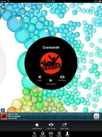 De muziek loopt door als je de applicatie op de achtergrond draait of als je in de app verder zoekt naar een andere band en een keer op ‘Play sample’ drukt. Per band muziek beluisteren is echter maar één kant van het verhaal van de applicatie. De ander is ‘Radio’. Die kiest liedjes voor je uit en begint te spelen. Door een (heerlijke!) slide-knop naar links of rechts te schuiven, kun je tussen nummers wisselen. Druk erop en een nummer pauzeert.