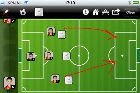 Tactieken is waarschijnlijk het gedeelte waar de voetballers zelf het meest mee te maken hebben. Het scherm laat letterlijk een voetbalveld zien waarop je alle voetballers en anonieme tegenstanders op het veld kan slepen, de bal op het veld kan projecteren en rode lijntjes kan trekken. Volgens de App Store-omschrijving is het eveneens mogelijk met andere kleuren lijnen te tekenen en het resultaat te delen op Facebook. Ook zou je kunnen kiezen tussen een heel en half veld. Leuke toezeggingen, maar de functies zijn wel érg goed verstopt in de app, als ze er al zijn.