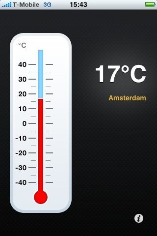 De Nederlandse ontwikkelaar Nicolas Koenig heeft z’n eerste applicatie in de App Store staan. Het gaat om Thermometer, een applicatie waarmee je de huidige temperatuur op je locatie kunt bepalen. De applicatie is simpel van opzet: na het opstarten bepaalt Thermometer je huidige locatie. Vervolgens krijg je een afbeelding van een thermometer te zien, die niet erg gedetailleerd is. Gelukkig staat naast de afbeelding de exacte temperatuur ter plaatse. Nicolas geeft aan, dat hij de opzet van zijn eerste applicatie zo eenvoudig mogelijk heeft gehouden. De instellingen zijn dan ook beperkt: je kunt aangeven of je de locatie (stad) wel of niet wilt zien en je kunt tussen graden Celsius en Fahrenheit schakelen.