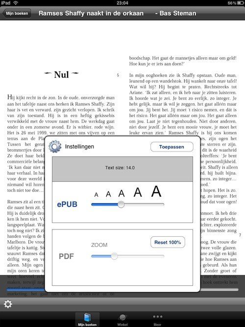 De nieuwe app is gratis te downloaden. Boekhandels krijgen een commisie op de verkopen via de app. Ook kunnen boekhandels zich achter het initiatief scharen en zich presenteren als boekhandel op de iPad. Als je de app installeert en opstart, moet je je Adobe ID invoeren om de applicatie te activeren. Vervolgens ga je naar het tabblad Winkel om het aanbod te bekijken. Er is bijvoorbeeld een biografie over Ramses Shaffy voor €11,95 te koop, het boek ‘Het Diner’ van Herman Koch kost €15,95 en voor ‘De Eenzaamheid van Priemgetallen’ moet je ook €15,95 betalen. De boeken zijn wel iets duurder dan papieren paperbacks die je van deze boeken kunt kopen en ook iets duurder dan het aanbod van Bol.com (de digitale versie van ‘Het Diner’ kost daar €9,95).