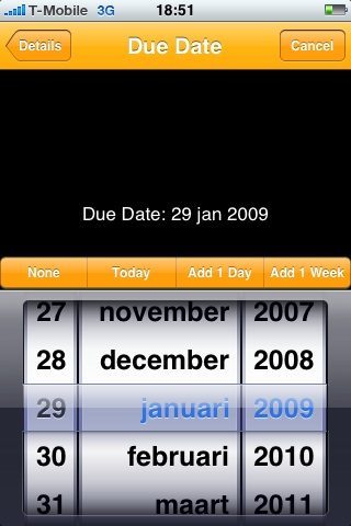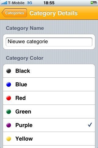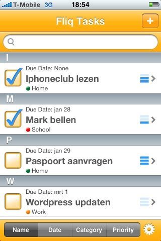 Onderin het scherm zie je de knoppen Name, Date, Category en Priority waarmee je de taken kunt sorteren. De liggende balkjes achter elke taak geven niet de status aan, maar de prioriteit: geen prioriteit, 1, 2 of 3. Wat niet mogelijk is, is een hiërarchie van taken of een uitgebreidere weergave waarmee je grotere projecten kunt plannen. Klein minpuntje is dat ik bij het invoeren van een taaknaam niet zo makkelijk meer wijzigingen kon aanbrengen. Wissen lukt wel, maar het vergrootglas halverwege de tekst plaatsen lukte niet; vandaar dat er in het screenshot ‘Iphoneclub’ in plaats van ‘iPhoneclub’ staat.