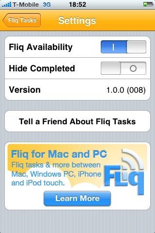 Het uitwisselen van taken gaat op dezelfde wijze als je bij Fliq en Fliq Notes gewend bent: via Wi-Fi. De applicatie zoekt andere Fliq-gebruikers in het netwerk, waarna je een taak kan doorsturen. De ontvanger moet natuurlijk wel Fliq-gebruiker zijn. De clou bij deze gratis applicatie (en de andere Fliq-producten) is dat de iPhone-applicatie gratis is, maar dat je voor de desktopversie moet betalen. De Mac- en PC-versie kosten $19,95 per gebruiker of $34,95 voor een gezinsaccount en dat is een behoorlijke prijs.